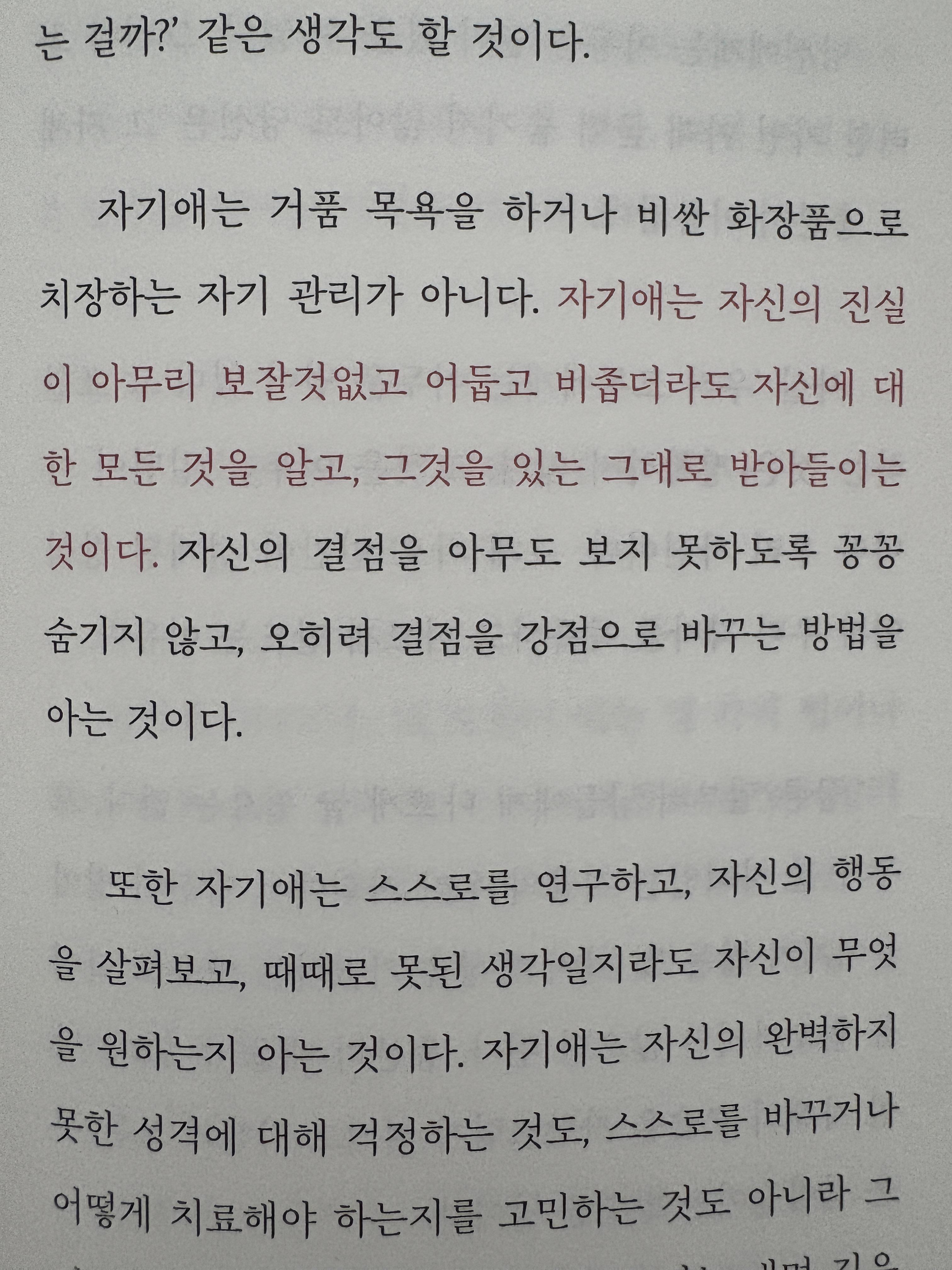 자기애는 자신의 진실 이 아무리 보잘것없고 어둡고 비좁더라도 자신에 대 한 모든 것을 알고, 그것을 있는 그대로 받아들이는 것이다. 자신의 결점을 아무도 보지 못하도록 꽁꽁 숨기지 않고, 오히려 결점을 강점으로 바꾸는 방법을 아는 것이다.