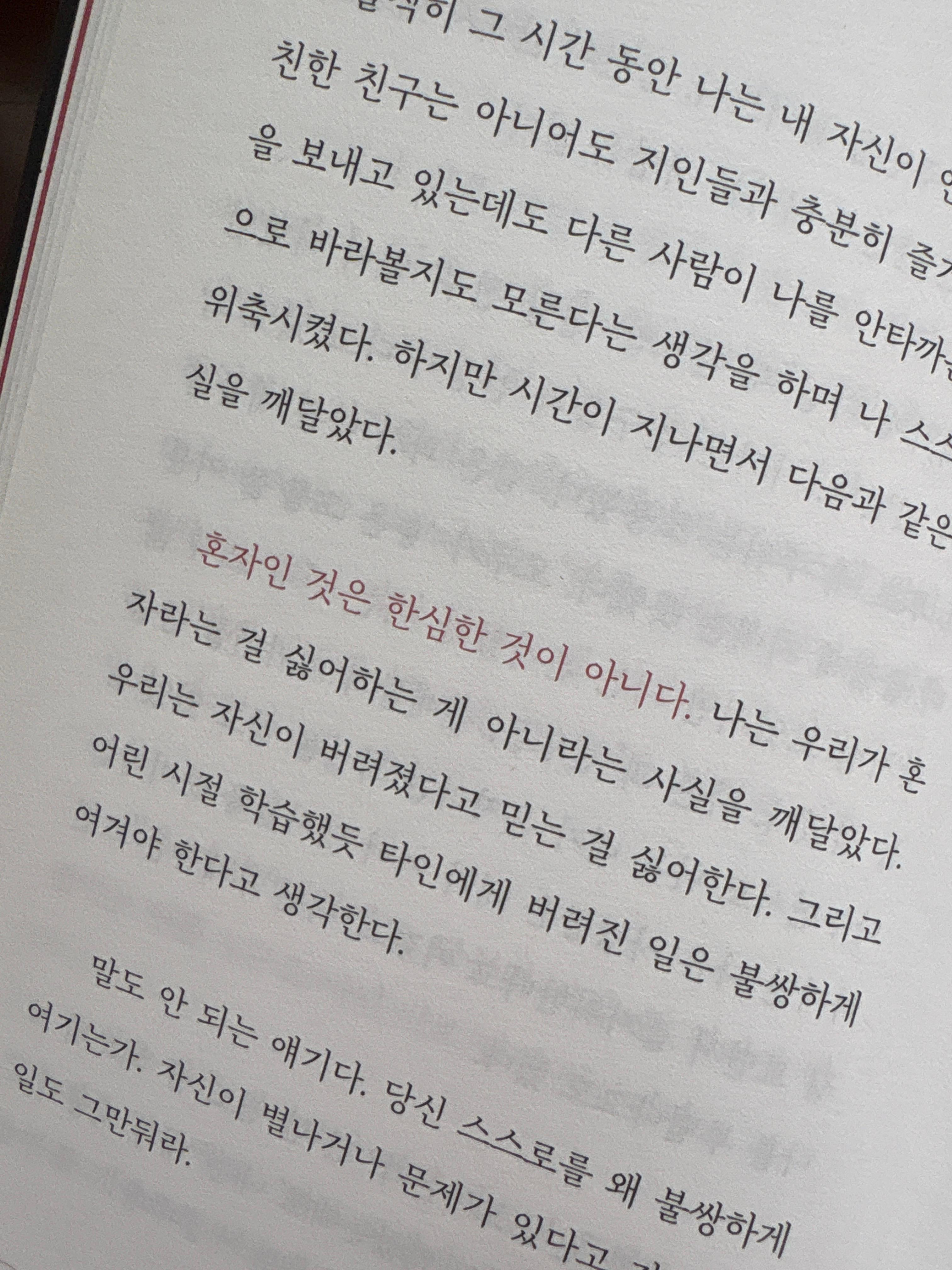 혼자인 것은 한심한 것이 아니다. 나는 우리가 혼 자라는 걸 싫어하는 게 아니라는 사실을 깨달았다.