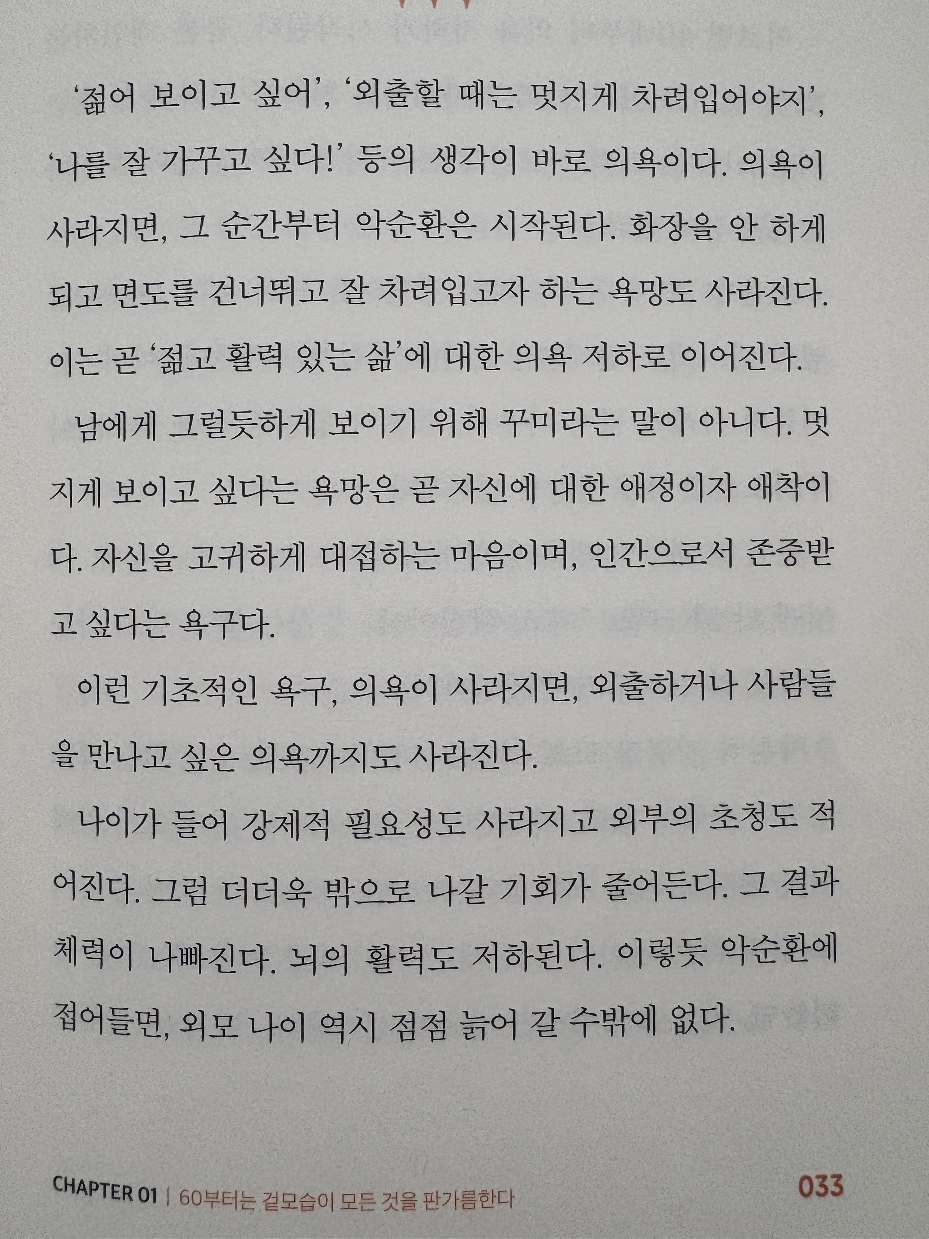 남에게 그럴듯하게 보이기 위해 꾸미라는 말이 아니다. 멋 지게 보이고 싶다는 욕망은 곧 자신에 대한 애정이자 애착이 다. 자신을 고귀하게 대접하는 마음이며, 인간으로서 존중받 고 싶다는 욕구다.